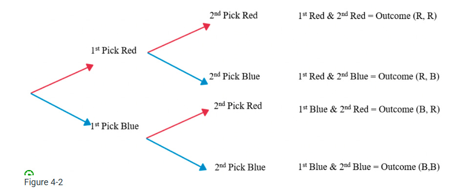 The sample space would be S = {RR, RB, BR, BB}. Note that the event RB and BR are considered different outcomes since they are picked in a different order and are considered distinct events.