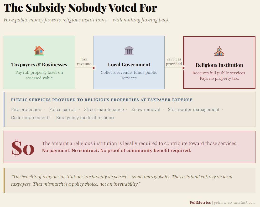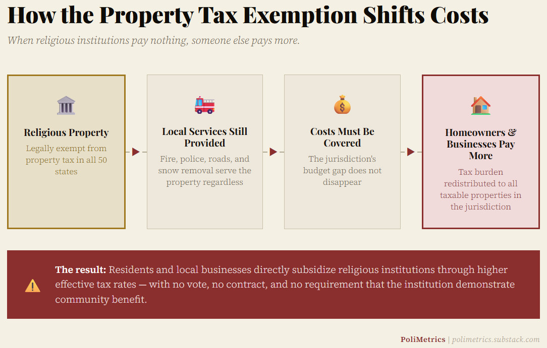 Property tax exemption for religious institutions is one of the oldest and least examined subsidies in American public finance. It exists in all 50 states. It is rarely debated. And almost nobody tracks what it actually does to the communities that absorb it.