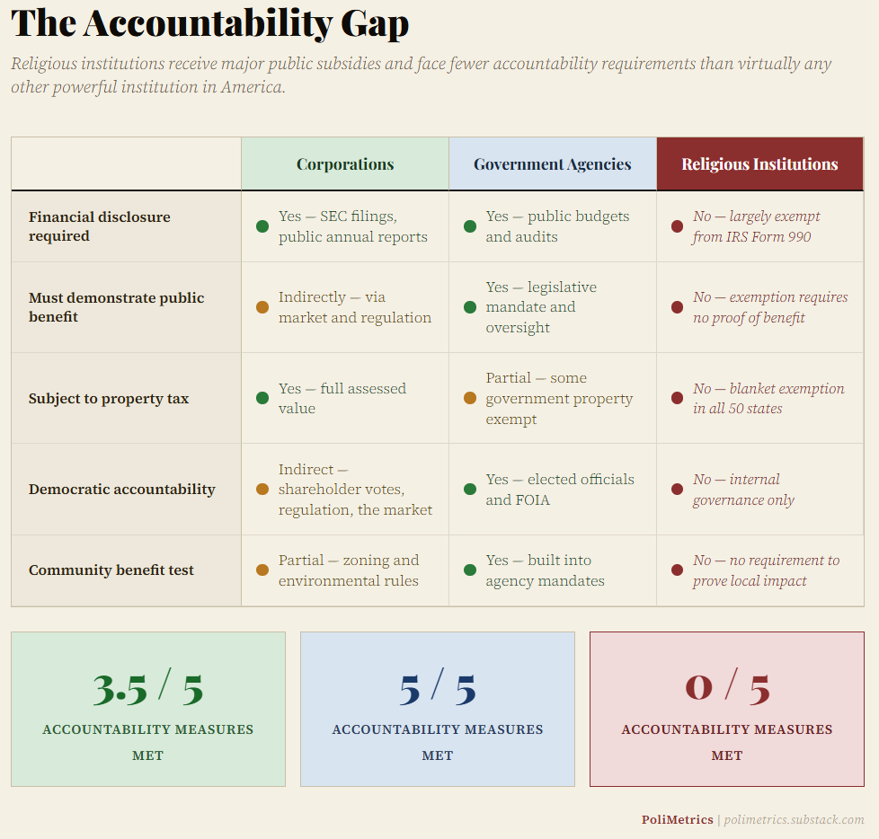 That is true regardless of which institution benefits, be it evangelical megachurches, Catholic dioceses, LDS temples, or any other tradition. The structure itself concentrates power and insulates it from accountability. Whether any particular institution uses that advantage well or poorly is a separate question. The policy architecture deserves scrutiny independent of the answer.