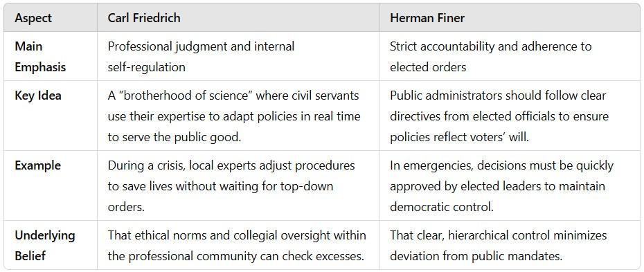 Carl Friedrich argued that public administrators—thanks to their specialized training and shared commitment to improving public welfare—should have the freedom to exercise professional judgment. He believed that civil servants form a community bound by common ethical norms and a deep dedication to public welfare. In Friedrich’s view, this community of experts is capable of self-regulation. They rely on technical knowledge, peer review, and mutual accountability to ensure that decisions made in the field are both effective and adaptable to local conditions.