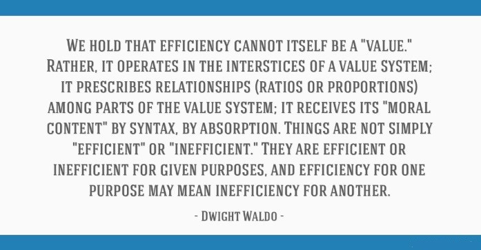 Decades ago, Dwight Waldo posed a deceptively simple question: “Efficiency for what?” Waldo argued that saving money is not the ultimate goal of government. Instead, efficiency must be a tool to improve public services and safeguard democratic values such as fairness, accountability, and public participation. For Waldo, the measure of efficiency shouldn’t be confined solely to dollars saved but should include the quality of services provided and the well‐being of citizens.